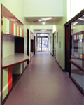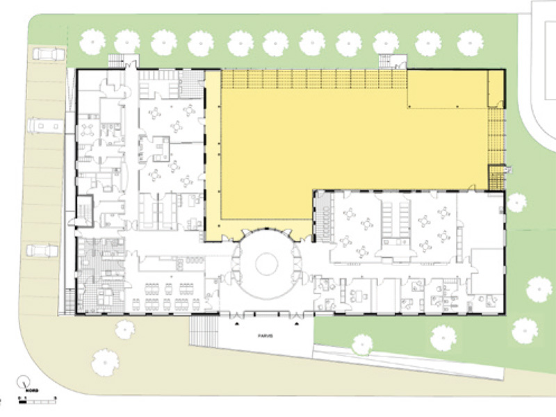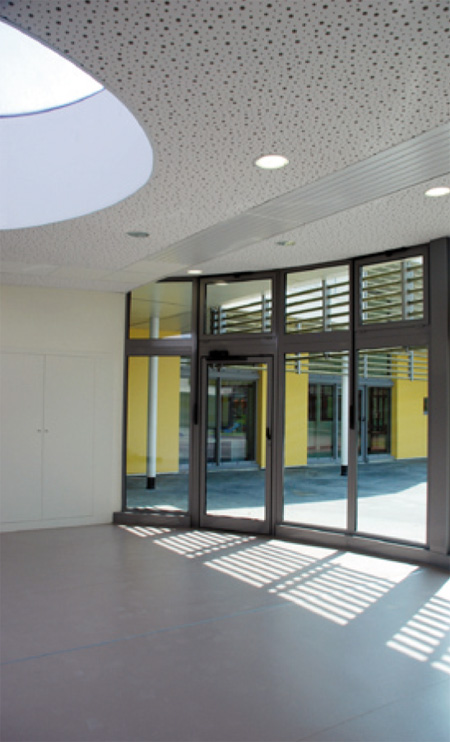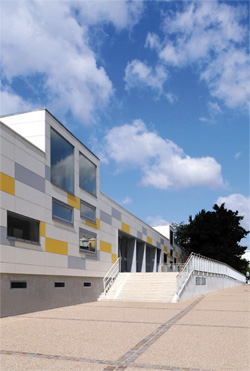 Le bâtiment se compose de 2 ailes épaisses, construites en ossature métallique légère et habillée de bardage coloré. Un travail sur les volumes et la pénétration de la lumière naturelle au cœur du bâti a permis l’élévation de sheds en toiture qui animent également les façades.