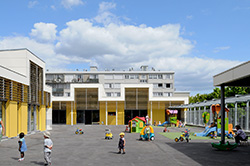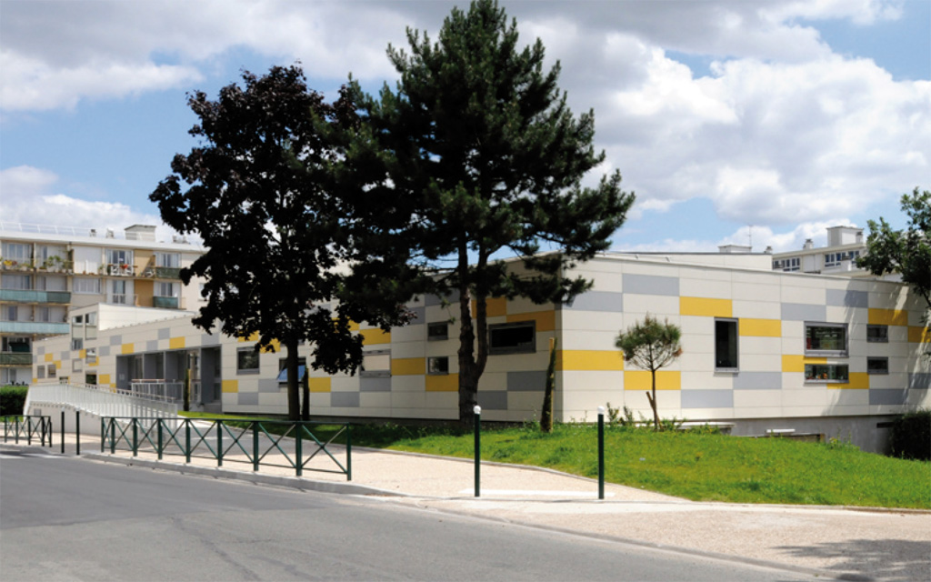 Cet équipement rassemble une école maternelle de 3 classes et une crèche de 30 berceaux dans un bâtiment construit en surélé- vation d'un parking existant, situé au cœur d'une cité des années 60. Figure imposée, le projet architectural porte une attention parti- culière au traitement du socle de l'édifice comme de ses toitures, cinquième façade végétalisée vue des habitations qui l'entourent. Deux grand corps de bâtiment sont implantés perpendiculaire- ment sur la dalle. Ils délimitent une grande cour orientée au Sud et à l’Ouest.